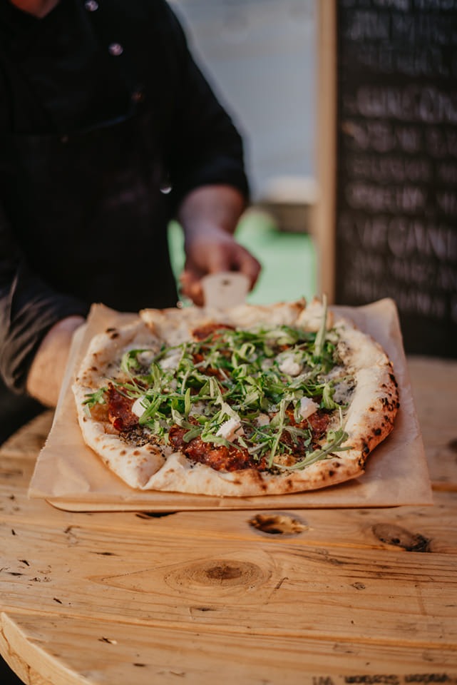 pasta z czarnej trufli, mozarella fior di latte, pieczarki, mascarpone, parmezan, rukola